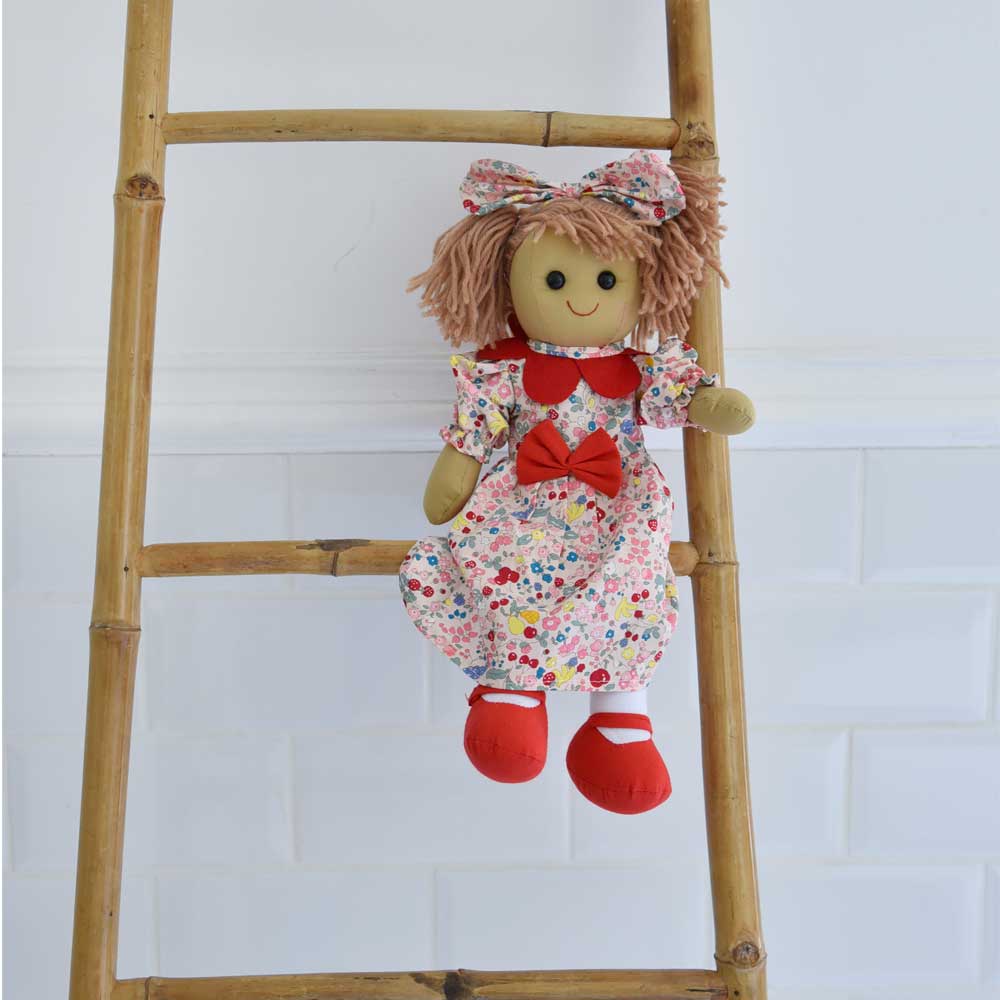 Sweet little dolly with red hair worn in bunches. She wears a long-sleeved dress with a print of fruit and flowers with a matching headband. The dress has a red petal-shaped collar and a bow at the waist and the dolly wears red shoes to match.